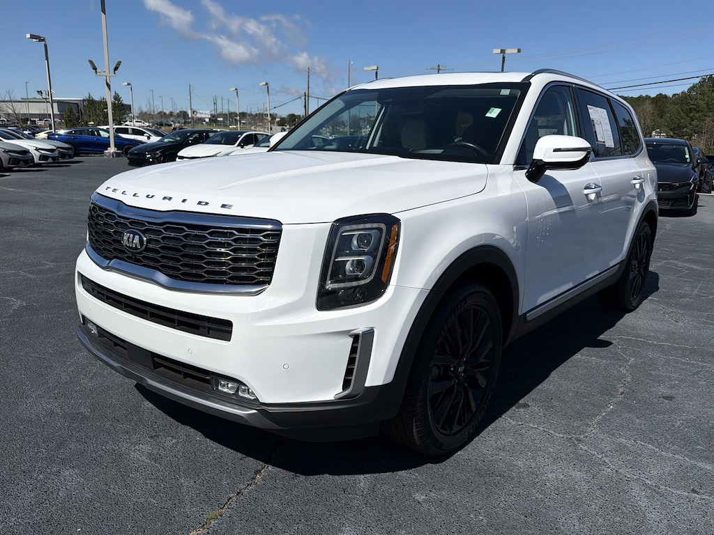 * JD Power Initial Quality Study (IQS) * JD Power Automotive Performance, Execution and Layout (APEAL) Study, Initial Quality Study (IQS) SX Prestige Package (110V Inverter, Heads-Up Display, Heated & Ventilated 2nd Row Seats, Premium Cloth Headliner & Pillar Trim, Premium Nappa Leather Seat Trim, and Rain-Sensing Front Windshield Wipers), Telluride SX, 4D Sport Utility, 3.8L V6 DGI DOHC Dual CVVT, 8-Speed Automatic, AWD, Glacial White Pearl, Gray Leather, 10 Speakers, 3.648 Axle Ratio, 3rd row seats: split-bench, 4-Wheel Disc Brakes, ABS brakes, Air Conditioning, Alloy wheels, AM/FM radio: SiriusXM, Apple CarPlay & Android Auto, Auto High-beam Headlights, Auto-dimming Rear-View mirror, Automatic temperature control, Brake assist, Bumpers: body-color, Cargo Cover, Compass, Delay-off headlights, Driver door bin, Driver vanity mirror, Dual front impact airbags, Dual front side impact airbags, Electronic Stability Control, Emergency communication system: 911 Connect, Four wheel independent suspension, Front anti-roll bar, Front Bucket Seats, Front Center Armrest, Front dual zone A/C, Front fog lights, Front reading lights, Fully automatic headlights, Garage door transmitter: HomeLink, Heated & Ventilated Front Bucket Seats, Heated door mirrors, Heated front seats, Heated steering wheel, Illuminated entry, Knee airbag, Leather Seat Trim, Leather Shift Knob, Leather steering wheel, Low tire pressure warning, Memory seat, Mud Guard Kit, Navigation System, Occupant sensing airbag, Outside temperature display, Overhead airbag, Overhead console, Panic alarm, Passenger door bin, Passenger vanity mirror, Power door mirrors, Power driver seat, Power Liftgate, Power moonroof, Power passenger seat, Power steering, Power windows, Radio data system, Radio: AM/FM/SIRIUS Premium Audio, Rear air conditioning, Rear anti-roll bar, Rear audio controls, Rear reading lights, Rear window defroster, Rear window wiper, Reclining 3rd row seat, Remote keyless entry, Roof rack: rails only, Security system, Smart Key w/ Push Button and Remote Start, Speed control, Speed-sensing steering, Split folding rear seat, Spoiler, Steering wheel mounted audio controls, Tachometer, Telescoping steering wheel, Tilt steering wheel, Traction control, Trip computer, Turn signal indicator mirrors, Variably intermittent wipers, Ventilated front seats, Wheel Locks, and Wheels: 7.5" x 20" Black Finish Alloy.